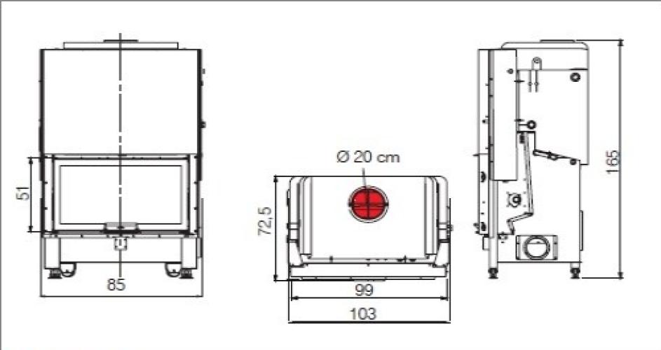 Termo chimenea de leña EDILKAMIN modelo WIDRO 85 de 34’7 KW Características: Color Negro Potencia nominal: 34’7 KW. Potencia útil: 29’7 KW. Potencia al Agua: 18’2 KW. Rendimiento: 85’7 %. Volumen calentable: 775 m³ Consumo: 7’5 Kg./h Hogar: Ecokeram blanco Salida de humos superior hembra 200 mm. ø Peso con embalaje: 500 Kg. Medidas: 165 x 103 x 72’5 cm. (alto x ancho x fondo) Contenido de agua: 108 l. Sistema post-combustión / doble combustión Puerta con apertura de subida (abatible para la limpieza del cristal) Estructura de acero de fuerte espesor Válvula by-pass gira-humos manual con función de Starter Maneta fija o removible Preparado para incorporar asador Pies con 4 ruedas para facilitar el movimiento